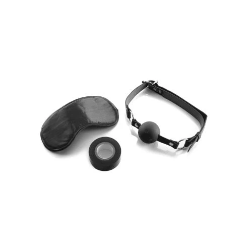 Start on the path of BDSM with this fun bondage set! Ideally equipped for beginners and the more advanced, it consists of an open ball-gag, fabric eye mask and a large roll of bondage tape.