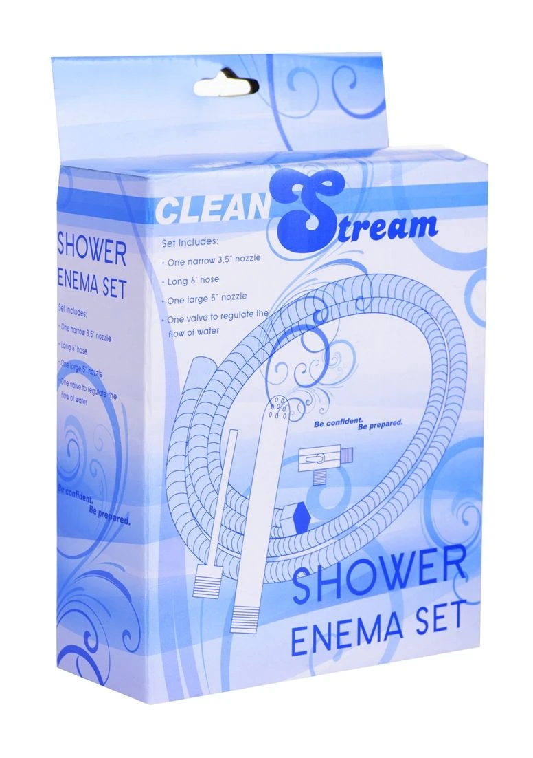 This enema kit now includes a free narrow nozzle.New, longer 6 foot hose makes your enema time much more convenient.You use the shower knob to regulate the force of water through the hose into their ass. This allows for a more gradual and comfortable enema experience.This is a very neat enema system. Its douche/enema nozzle is outfitted for use as a shower attachment. The Shower Enema Kit comes with two nozzles, one is 5″ and the other is 3.5″. It also comes with a 6ft (2m) metal hose. One end of the hose screws into your shower, the other end is where you attach your choice of nozzle. Where the Shower Enema Kit connects with your shower it has a valve that directs the water either through the nozzle and into you or to the shower head
