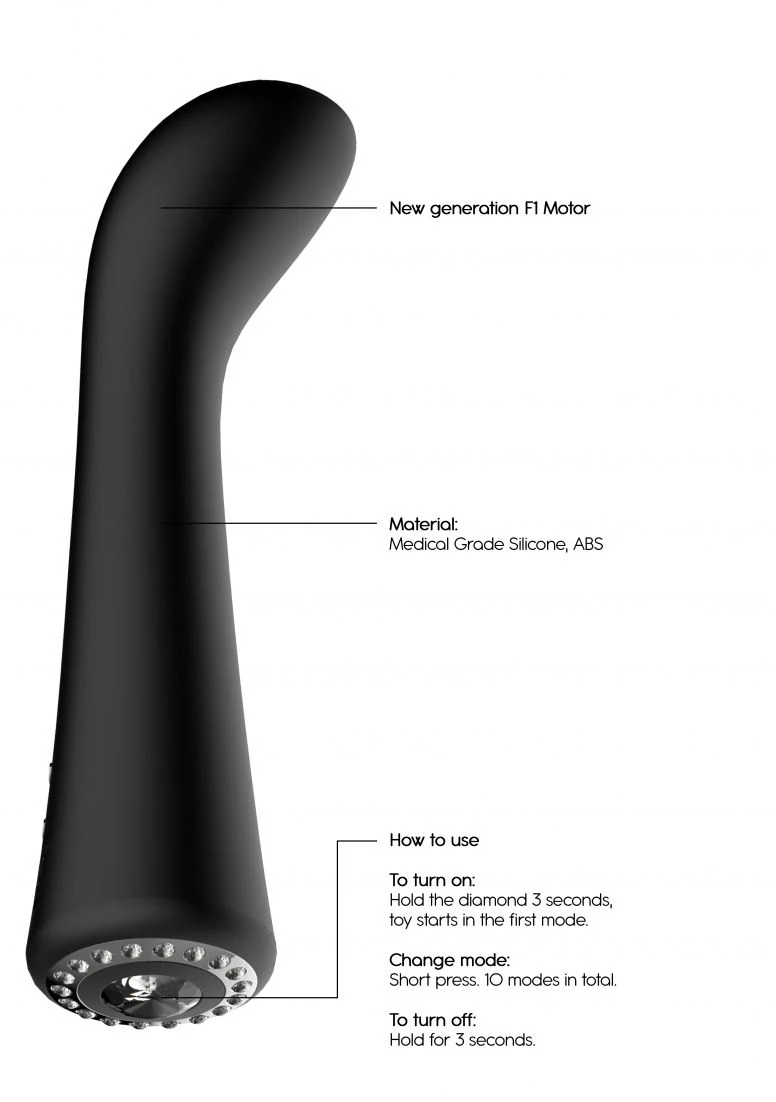 The DISCRETION G-Spot Vibrator is whisper quiet at less than 50dB while delivering a powerful orgasmic punch when required. It’s new generation F1 Motor, with 10 different modes to choose from, revs up to 8500 rpm in the tip for extra clitoral stimulation and G-spot stimulation. With a beautiful diamond feature on the bottom, adding an extra touch of elegance, it fits like a glove in a discreet box with a USB outlet, giving 60 minutes of unbridled pleasure on a single charge. Cable included.
