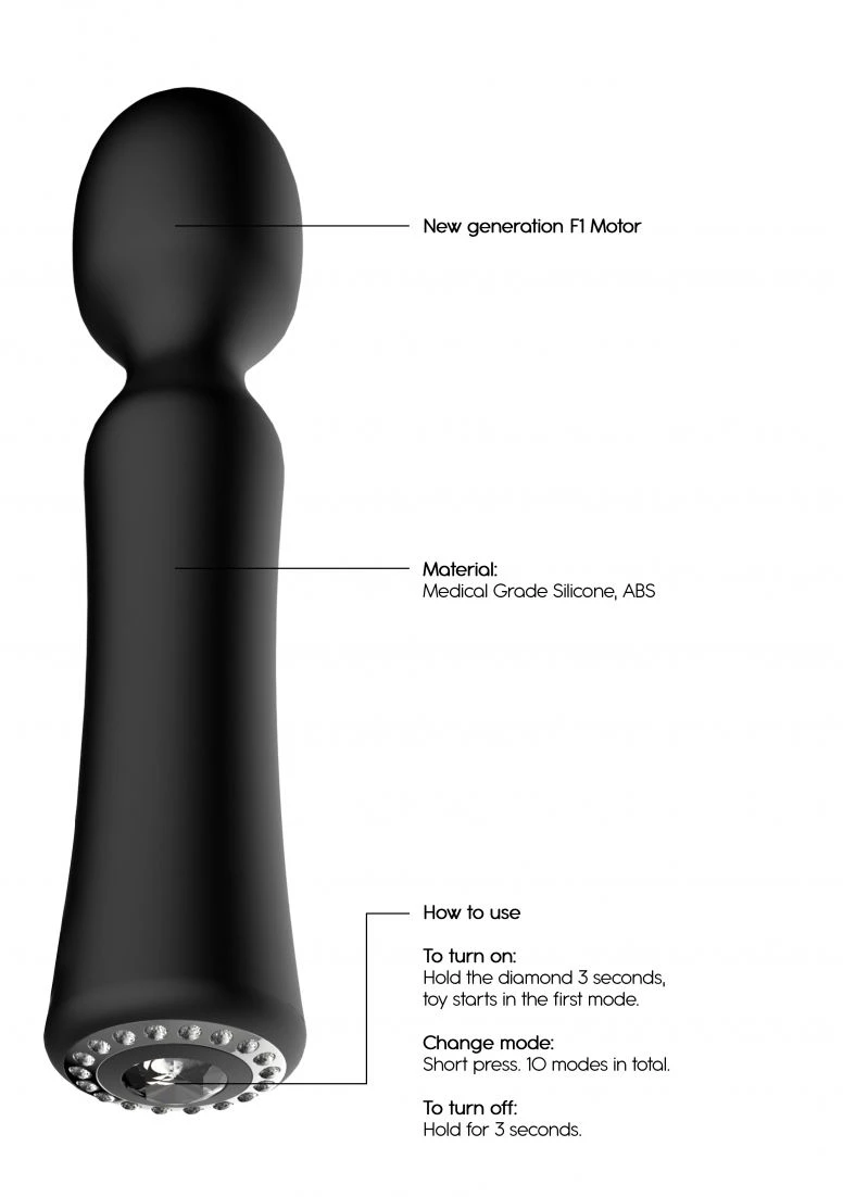 The DISCRETION Wand Vibrator is whisper quiet at less than 50dB while delivering a powerful orgasmic punch when required. It’s new generation F1 Motor, with 10 different modes to choose from, revs up to 8500 rpm in the pulsating head for extra clitoral stimulation. With a beautiful diamond feature on the bottom, adding an extra touch of elegance, it fits like a glove in a discreet box with a USB outlet, giving 60 minutes of unbridled pleasure on a single charge. Cable included.