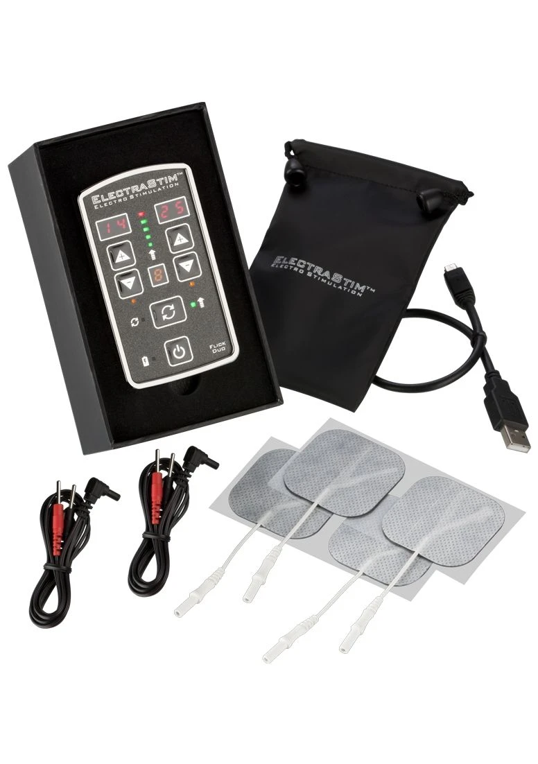 The ElectraStim Flick EM80-E pack includes a Flick Duo dual-channel stimulator, all required cables and a set of 4 ElectraPads, so you have everything you need to start experimenting with electro sex. Perfect for beginners or those upgrading an old e-stim stimulator, Flick has a host of features to explore. A luxurious slim-line stimulator with LED display and ergonomic control. Try the 4 Flick modes for stimulation that flows in sympathy with a โflickingโ wrist action for truly customisable patterns. Flick stimulators are perfect for enhancing masturbation, foreplay and sex with the thrilling and unique tingling and pulsating of electrosex. Stimulator Features 8 different stimulation patterns 4 motion sympathetic Flick setting โ stimulate using a flicking motion across one or both channels 25 intensity levels 2 isolated stimulation channels โ Individual intensity control for each channel USB rechargeable 3-year guarantee when you register your purchase Includes EM80 stimulator 4 Conductive pads 2 x connecting wires (2mm pin connection) USB charging cable Storage Pouch