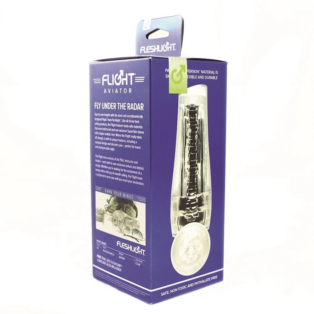Fleshlight has taken its #1 selling male sex toy and made it even better. The Flight is sleek, compact, aerodynamically designed and discreet – perfect for travel and storage. Soar to new heights with the sleek and aerodynamically designed Flight from Fleshlight. Like all of our best-selling products, the Flight features body-safe materials that were built to last and our exclusive SuperSkin sleeve with a hyper-realistic feel. Where the Flight really takes off, though, is with its unique features, including a compact design and discreet case – perfect for travel and storing in plain sight.The Flight crew consists of the Pilot, Instructor and Aviator – each with its own exclusive texture and distinct design. Whether you’re looking for the excitement of a bumpy ride or the joy of smooth sailing, the Flight team is prepared to serve you until you reach your destination.