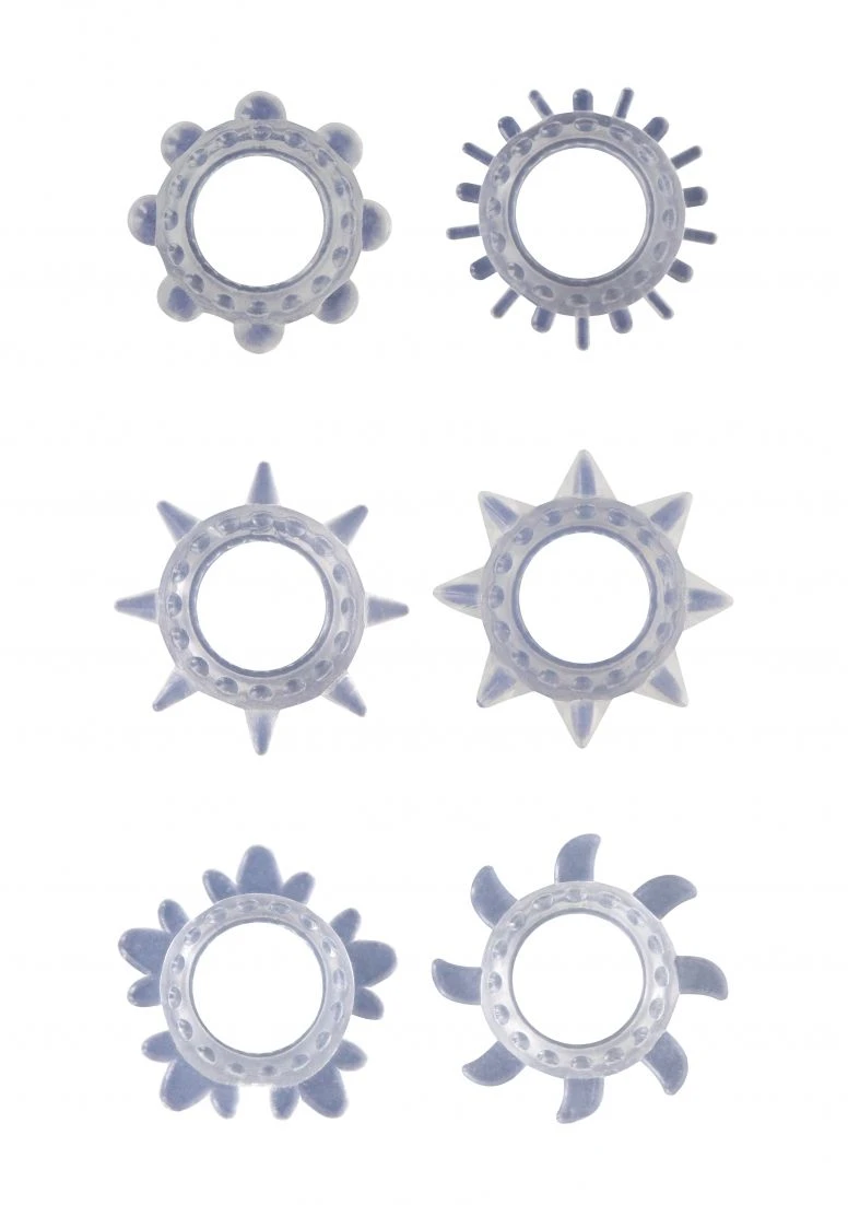 These very flexible and stretchable little gems will never let you down. You will be spoilt for choice with this fantastic flex set! No less than 6 exciting cock rings, all with different stimulation rims, are there to tease and please! Made from very flexible and stretchable TPE, these little gems will never let you down. A variety of 6 different embossments on the outside of the rings are there to surprise and excite! This beautiful set is available in 2 colour versions: Black and Clear.