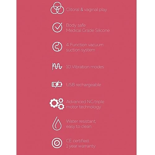 | Specifications | Specifications Product Height: 23 cm Product Diameter: 3,9 cm Vibration Speed Modes: 10 Suctions Speed Modes: 4 Material: Silicone, ABS Waterproof: Yes Phthalate free: Yes Noise level: max. 55 dB. Batteries: Rechargeable Battery life: 50 min. Fully charged in: 180 min. |