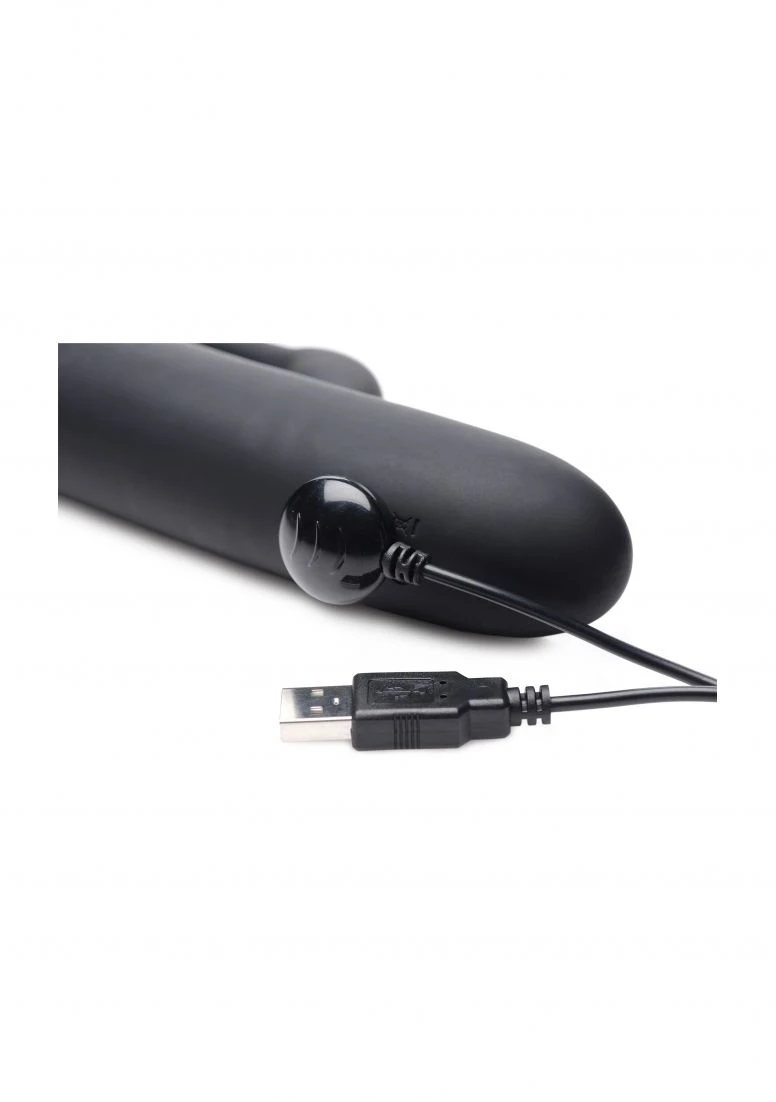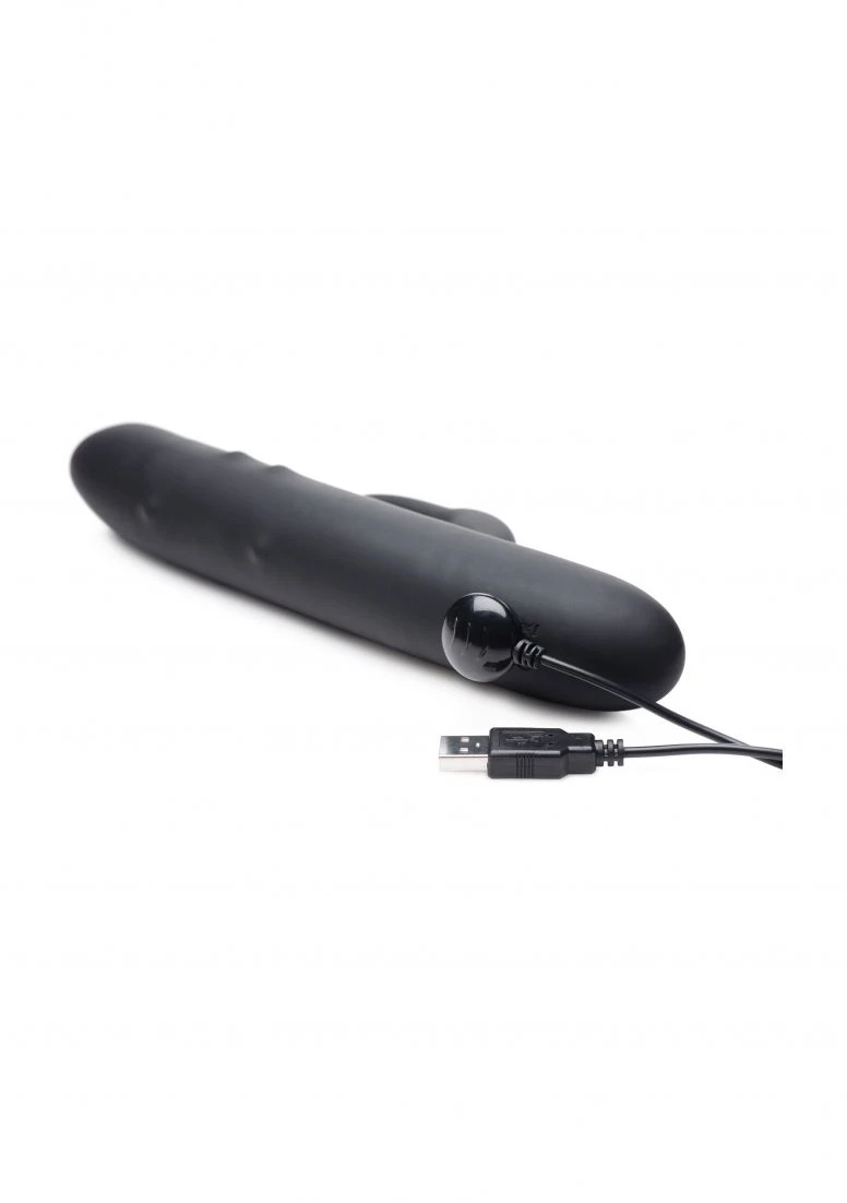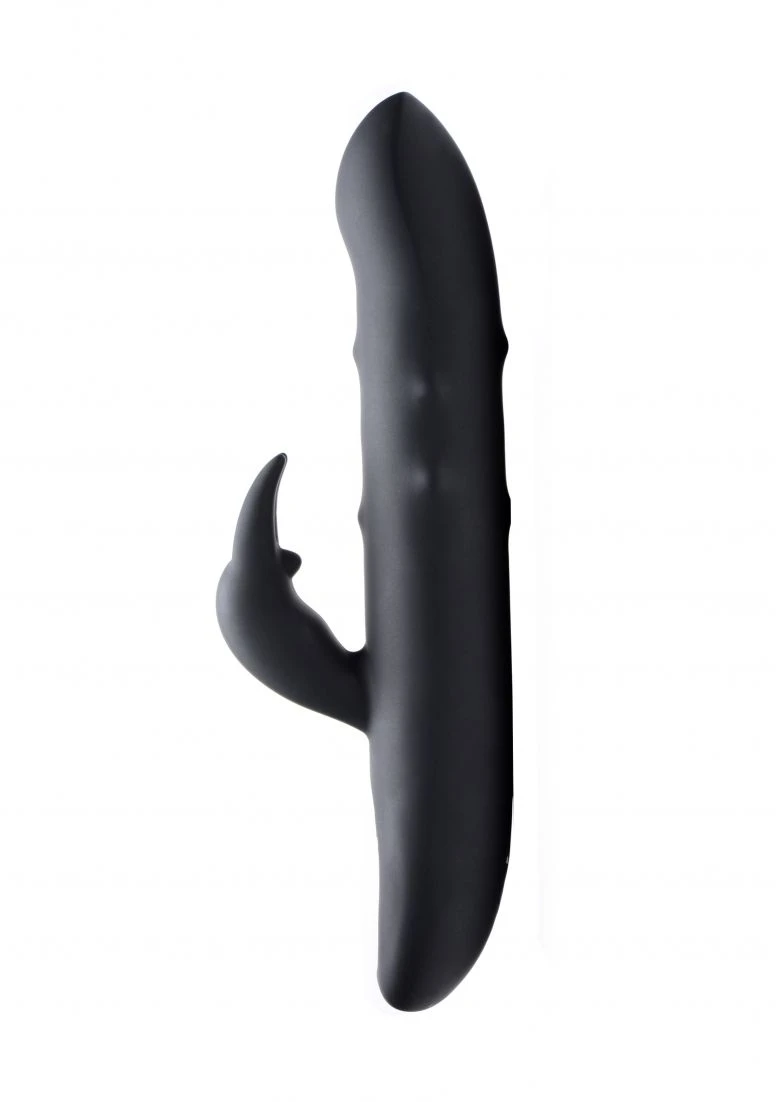 Savor the sensations from a buzzing bunny and the silky-smooth shaft as two very different sensations combine for one incredible blended orgasm. This premium silicone vibrator features 3 speeds of thrumming and 7 patterns of throbbing, as well as an ample shaft that will massage you with undulating beads and 3 vibrating speeds of its own. The elegant gem-adorned control panel is simple to use. A protruding bunny nose will pinpoint your clit for vibration, while the ears will flutter around it for an entirely different sensation. This pleasure tool is magnetically rechargeable and waterproof so that you can treat yourself in the bath or shower. The phthalate-free material is non-porous for an easy clean with mild soap or toy cleaner. Avoid use with silicone lubricants.