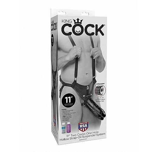 The King Cock Two Cocks One Hole Hollow Strap-On Suspender System is phthalate-free and made in Pipedream’s state-of-the-art USA manufacturing facility. A long, hollow plastic tube, measuring 1.5” (3.8 cm) in diameter, is placed inside the rubber dong, making it perfect for men with performance problems, though it’s sturdy enough for all sexes to wear.
