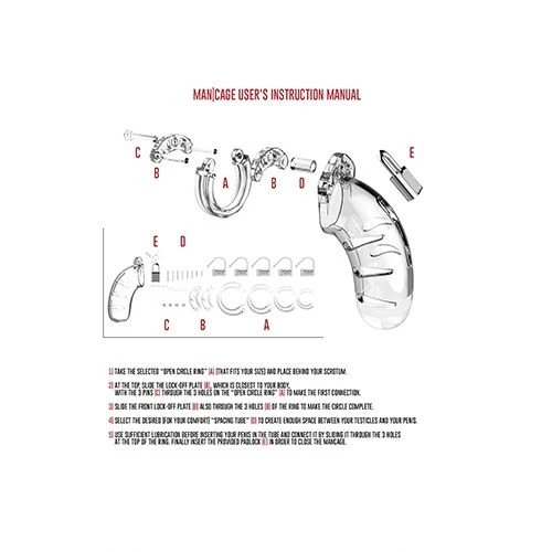 The Man|Cage Chastity Cages are manufactured from high-grade polycarbonate, a very light, durable and hypoallergenic material. The cage consists of three parts which fit perfectly together. The two guidance pins connect the top parts and the oval taper pin connects the rings with the cage. A variety of rings in different sizes and distance pieces will allow you to create the perfect size! The rings have a comfortable fit and are absolutely safe. A metal lock or tie-wrap lock can easily close the cage. The included tie-wrap locks ensure that they will not trigger the alarm of metal detectors at parties, festivals or even airports! As hygiene is very important while wearing a cage, the superior Man|Cage series are equipped with a variety of vents and a urination opening. The cage makes it impossible to get an erection but it will be, after liberation, super intense, just like the freeing orgasm to follow! The Man|Cage Chastity Cage gives the key-holder optimal power over sexual gratification!