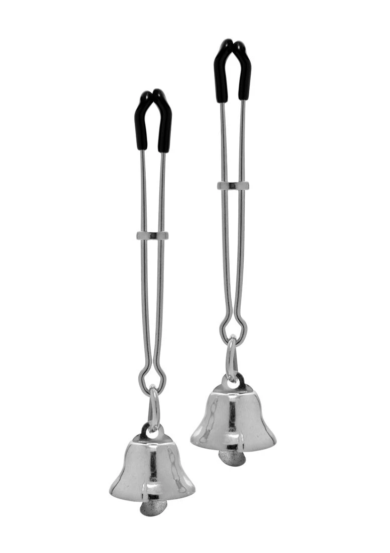 Audio erotica is in play when these devious little bells are ringing. Your plaything will look and sound tantalizing when these clamps are placed just so. These tweezer style nipple clamps have a bell attached at each end that makes a low pitched ringing sound when in motion. The vinyl coated ends provide comfort and grip while the sliding ring allows for varying amounts of pressure. Ideal for beginners and clamp aficionados alike.