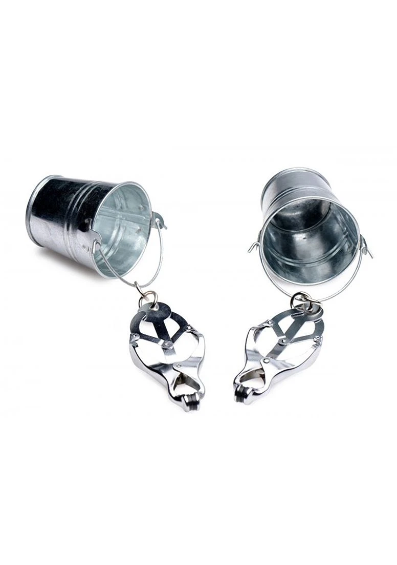 Put your submissive or slave through a unique torment with a set of nipple clamps that allow you to add weight in an unusual way! In the style of butterfly clamps, or clover clamps, these attractive pincers get tighter as they are pulled. Rubber tips ensure that all pain is in the form of pleasure and that they maintain their grip. To add weight, simply fill the small, hanging buckets with water, lube, sand, stones, or whatever your devious mind can come up with. You will love watching your plaything carry the buckets around by their tits!