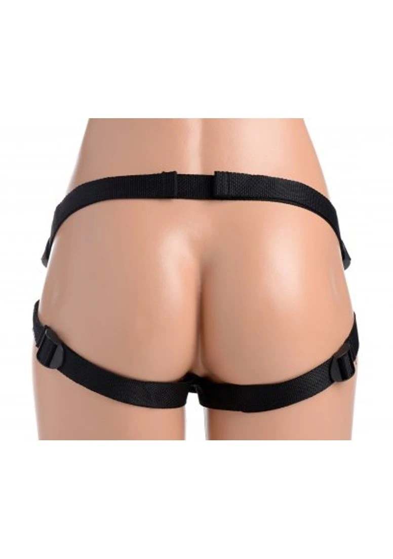 Show your man who the boss is with a kit that includes everything you need to dominate him, top to bottom! Rob him of his sight but leave that useful mouth accessible when you slip a stretchy black hood over his head. The padded blindfold area will keep him in the dark while you surprise him with every touch. Meanwhile, suit up with a harness that adjusts attractively and securely around your booty. There is even a pocket for a small bullet vibrator on the inside of the front panel, to ensure that the Mistress is always pleased! Slip the included dong into the O-ring or use another depending on preference. A second O-ring is included to accommodate many sizes. The premium silicone dildo is non-porous to make it perfect for pegging. Clean with mild soap and warm water after use and avoid use with silicone lubricants.