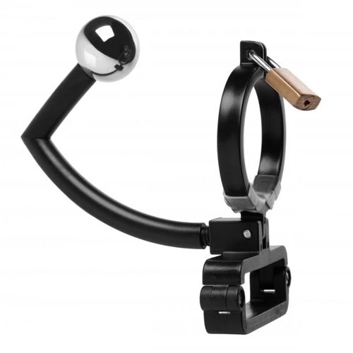 In addition to being used for chastity, this versatile toy can also be used without the cage. Just secure the top of the ring with one of our brass locks, and this device turns into a cock ring that you can hook your accessories to! Use the attached ball clamp alone or with the insertable arm. . Is it reward? It is your domain…you decide.