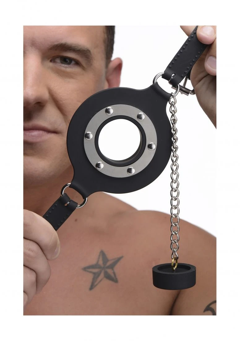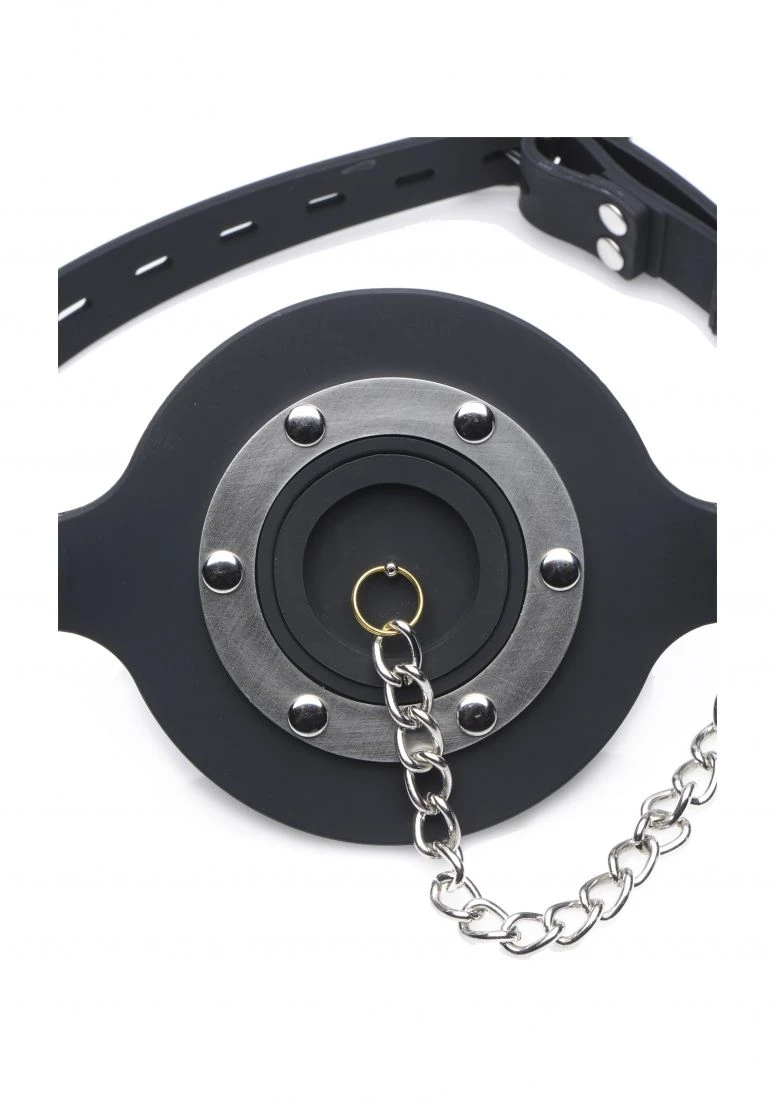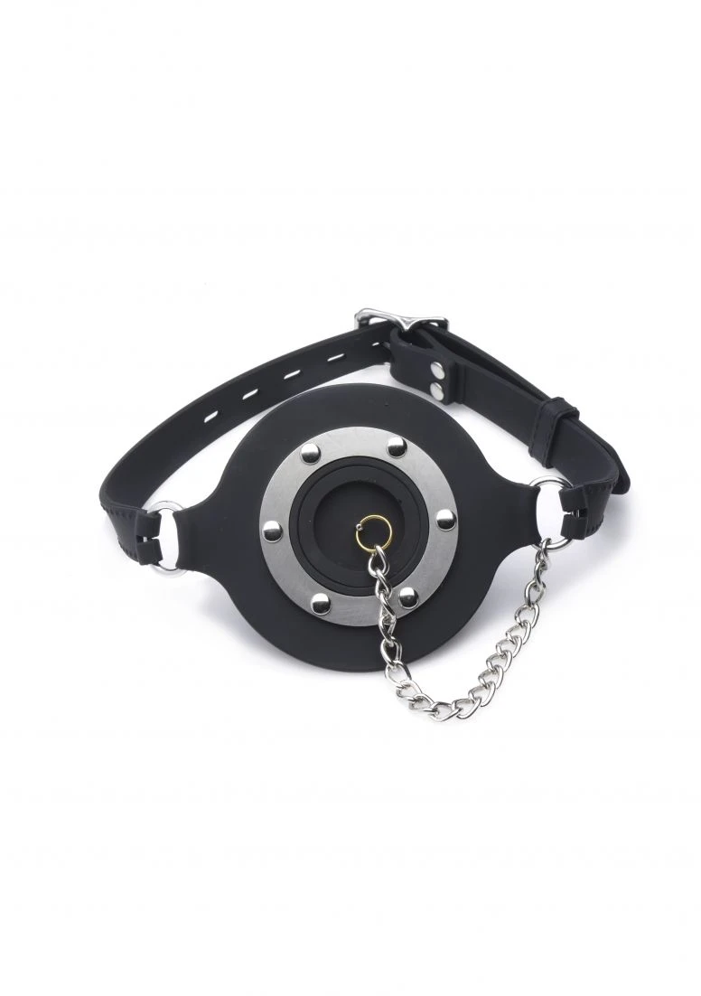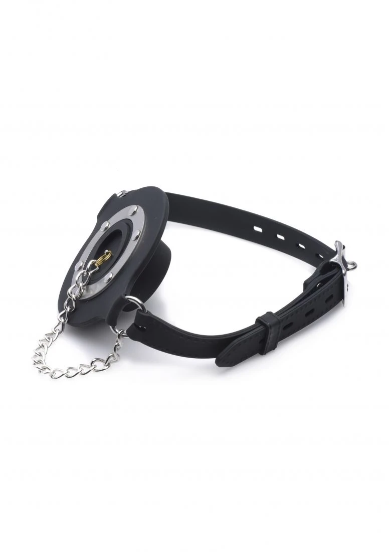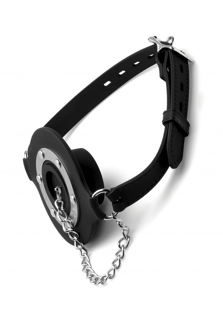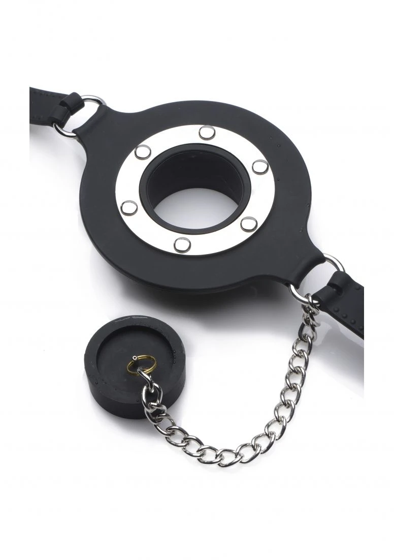 Plug up their pie hole with this unique silicone gag. Push the ring past their teeth and secure the soft straps at the nape of their neck. The buckle can accommodate a lock, not included, to ensure that there is no hope for escape. Keep your plaything plugged up so that all you can hear are muffled moans and garbled groans. Or remove the plug to savor every whimper and gasp. The plug is connected by a chain so that you never lose it. The opening is 1.5 inches to accommodate the possibility of forced penetration. The premium silicone material is non-porous and phthalate-free, and cleans easily and thoroughly with mild soap or toy cleaner. All hardware is nickel-free.