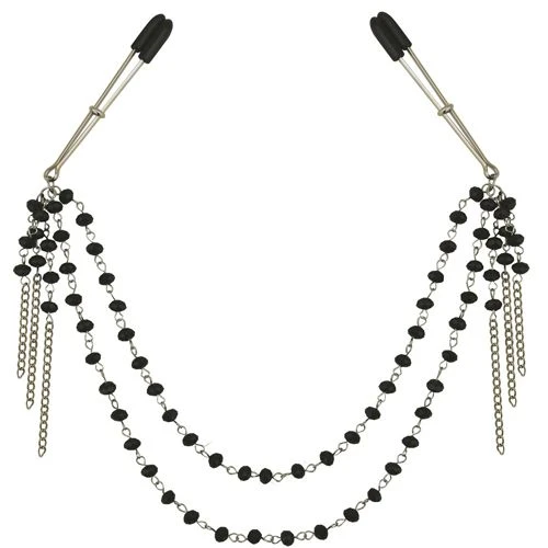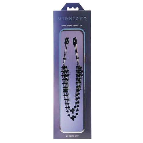 Sportsheets new range, Midnight, brings Parisian glamour, drama and elegance to bedroom play. These glamorous, black faceted-bead nipple clips are a beautiful adornment to amp up the glamour. The rhythmic rattle of the beads and chain add additional sensory pleasure. These clips feature black rubber-tipped nipple clips that adjust for increased intensity. • Nickel-free metal • 16.5 inch (41.91cm) chain • Perfect for beginners of BDSM