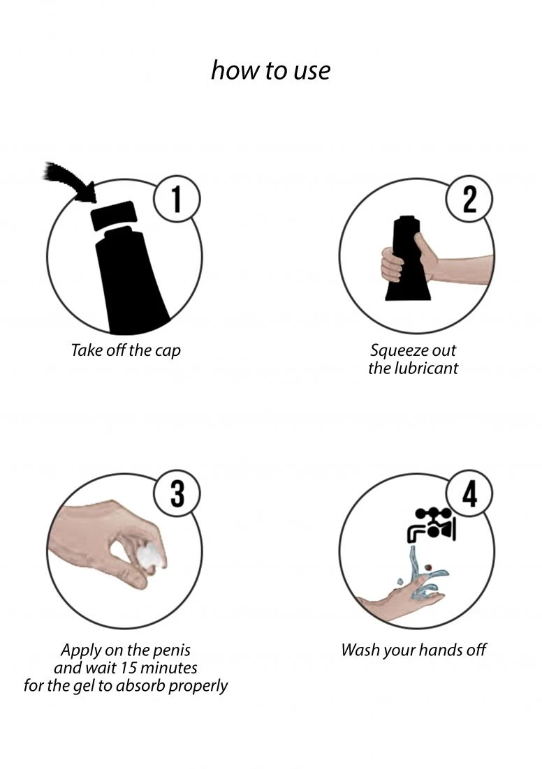 Delay gel is the method of dealing directly and effectively with premature ejaculation. Directions for use: Squeeze a small amount of gel onto your fingertips and massage directly onto the penis. Allow the effect to unfold for 15 minutes. The gel has now soaked into the skin of the penis thoroughly and can develop its local numbing effect. For external use only. Keep out of reach of children. Store in a cool, dark place.