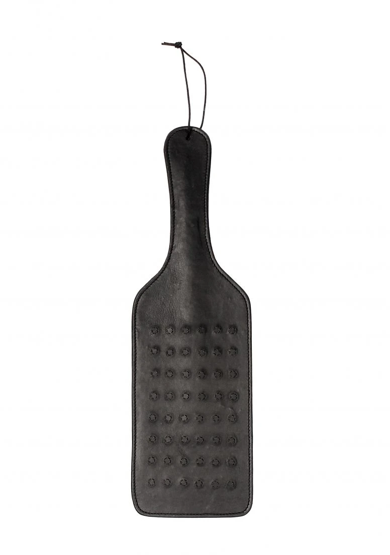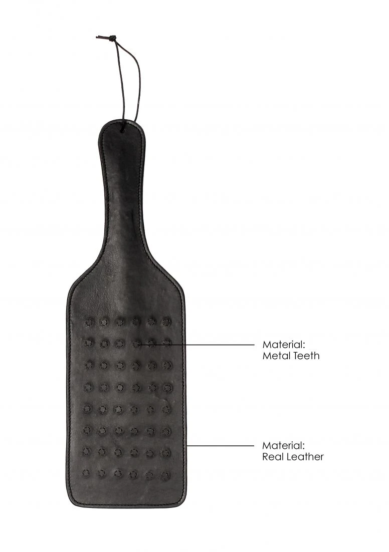 If you like your submission play a little more extreme, the OUCH! LARGE VAMPIRE PADDLE is a must-have! This kinky spanker made of high-quality lamb/saddle leather will give an extreme twist to all of your impact play fantasies. The Vampire Paddle has 48 spiky studs to tease your sub’s anticipating body. It will bite into the skin to deliver intense sensations and it both looks and feels the part, in even the kinkiest of scenarios. The paddle has a total length 41cm (17”) including the handle of 15cm (5.9”). It has a width of 14cm (5.5”) and weighs a respectable 380 grams (13.4oz).