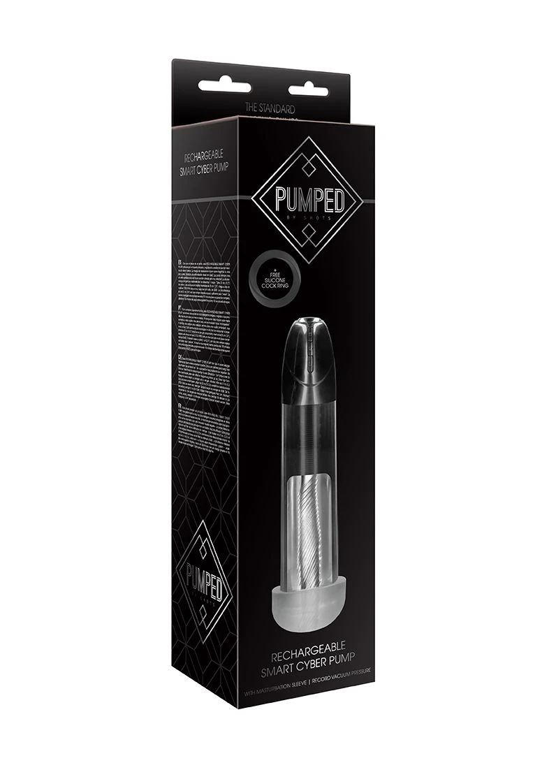 With just the touch of one value, this RECHARGEABLE SMART CYBER PUMP will take you through a complete smart cycle and record your max vacuum pressure at the same time – allowing you to concentrate on enjoyable sensations. The super-soft masturbation sleeve magnifies the view of your penis for unmatched visual stimulation. The pump always creates a tight seal for comfortable but very effective suction! This high-tech pump is really easy to disassemble and clean. Standing 31 cm (12.2″) tall and with a chamber that can hold a length of 20 cm (7.9″) it revs up to an impressive 3700 RPM at a very low noise level of less than 55dB. The inner girth is 6.1 cm (2.4″) so there always enough space to “grow”. The built-in rechargeable battery needs 120 minutes for a full charge giving 110 minutes of extravagant playtime!. This pump is NOT waterproof. HOW TO USE Lubricate the sleeve of the cylinder and your penis with a water-based lubricant before use. DO NOT use silicone lubricants. If you feel uncomfortable with the vacuum at any time, release some of the vacuum through the vacuum release value. To achieve the best result, you can apply some efficient techniques: such as: alternating the vacuum from time to time or making stroking movements after erection. CHARGING LED light flashes while charging, and glows solid when fully charged.