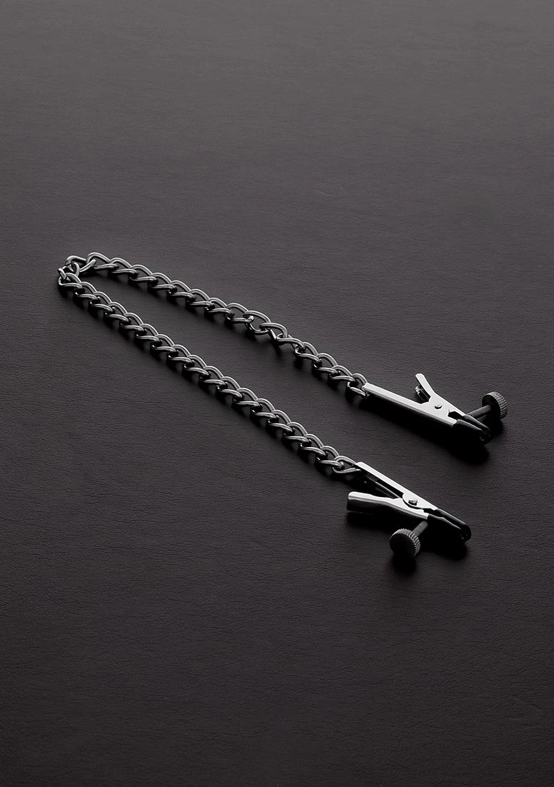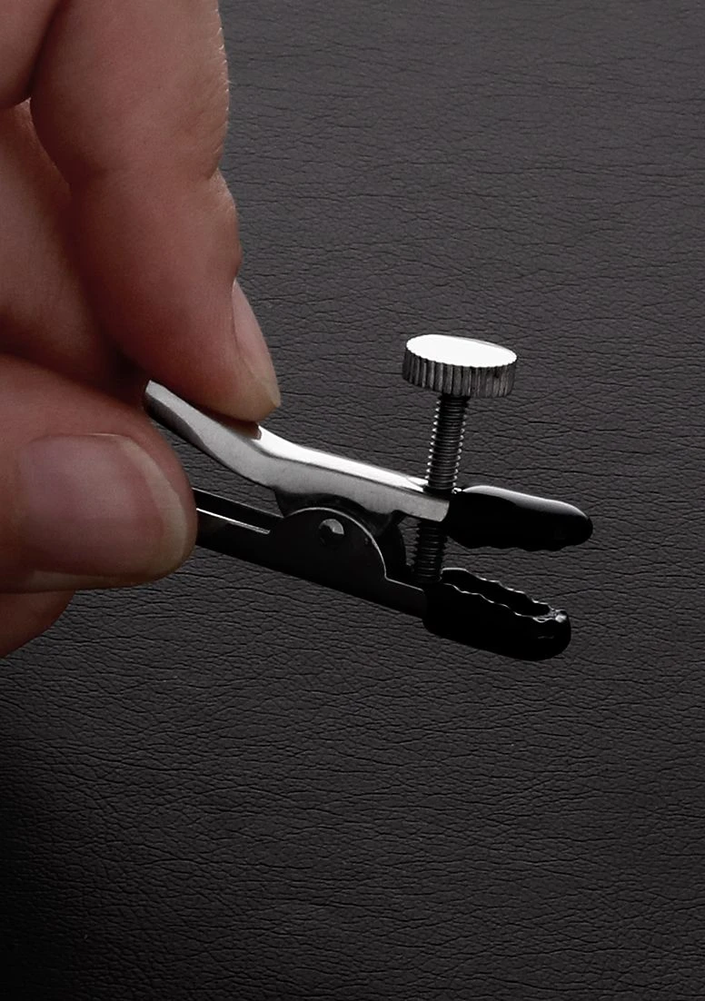 Adjustable nipple clamps made of stainless steel. These large alligator style clamps are great for nipple play. The tips of these clamps are vinyl coated which provides a softer feeling against the nipples. The intensity of the tension is adjustable with the screw located near the tips of the clamps.