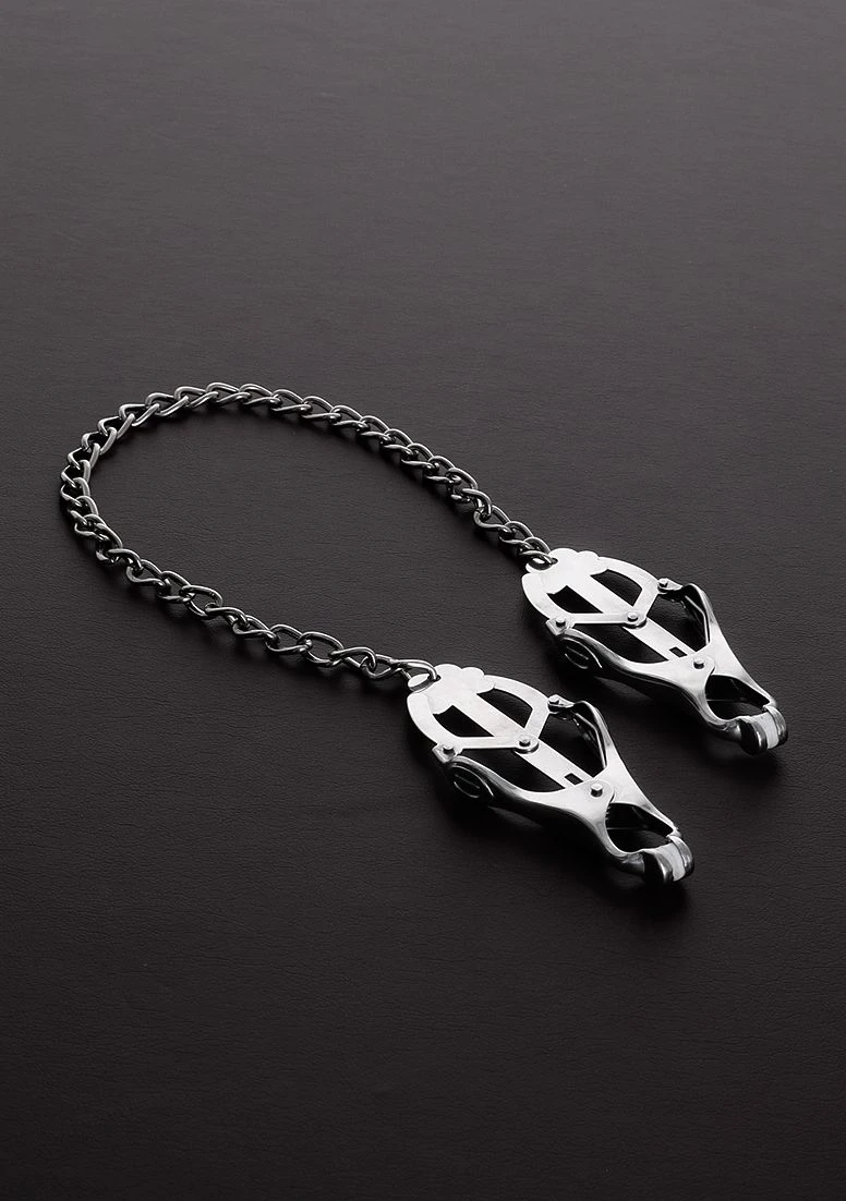 These are the classic clover nipple clamps with long chain connecting the two clamps together. These clover nipple clamps work their magic best when attached to both nipples and slight pressure is applied to the chain.