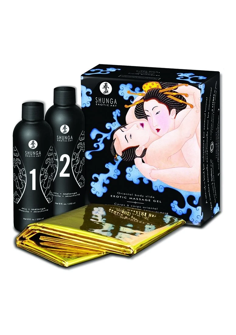 – Makes 1 gallon of gel – Waterproof sheet included – Detailed instructions This oriental body-to-body massage is an intensely sensual and pleasing experience where two bodies, in almost complete weightlessness, move effortlessly against each other in a slip-and-slide motion. Once the body gel is poured onto the two naked bodies, it creates an intoxicating and aphrodisiac effect. The skin turns silky smooth and transforms tender caresses into sensual touches. Step 1: Fold your thick sheet in two and place on floor Step 2: Roll towels on the length side to form a cylindrical or tube-like shape and place onto the patted surface by following its edges to form a rectangle. Step 3: Unfold gold waterproof sheet and recover the surface by carefully smoothing out the center and level out edges in order to form a basin-like shape. Step 4: Pour 3.5 Qts (3.5L) of warm tap water and bottle #1 in the selected container. Step 5: Add bottle #2 and mix well. Creates 4 Qts (4L) of Massage Gel. Gently pour the lukewarm Massge Gel on your lover’s body. Begin the body-to-body massage. Let your imagination be your guide. Let the fun begin!