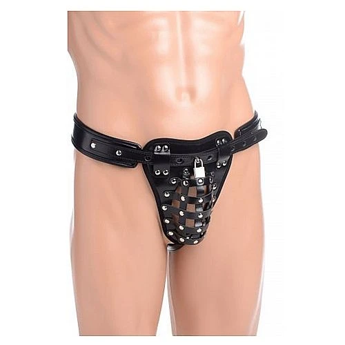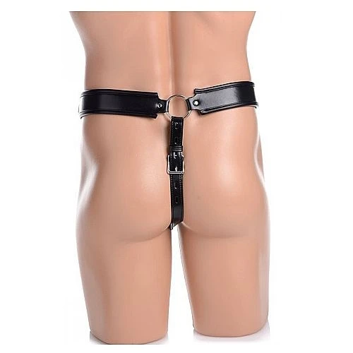 Lock your man up in a comfortable cage that denies him access to his package! This leather-like jock strap locks in the front and back to secure the straps tightly, ensuring that he has no hope for escape. Both the waist strap and the rear strap are adjustable for a custom fit. This sexy chastity belt keeps him confined and at your mercy so that he is reminded that his body belongs to you!